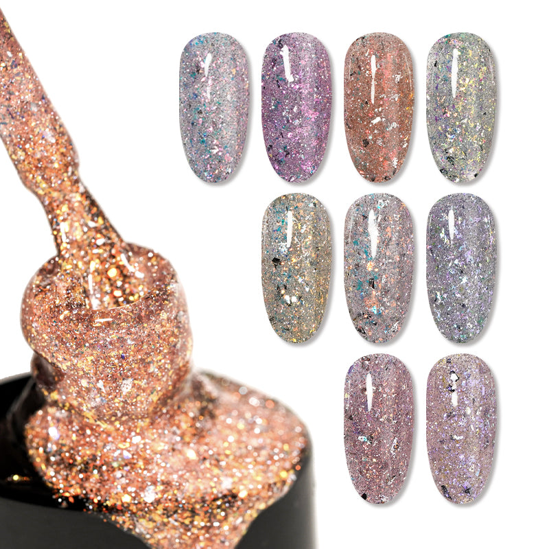 Мерцающая пудра, крупные блестки, сусальное золото, 3 эффекта в 1 флаконе геля-единорога, сияющий и красивый, этот 10 мл гель-лак обеспечивает стойкое глянцевое покрытие, которое обязательно впечатлит.